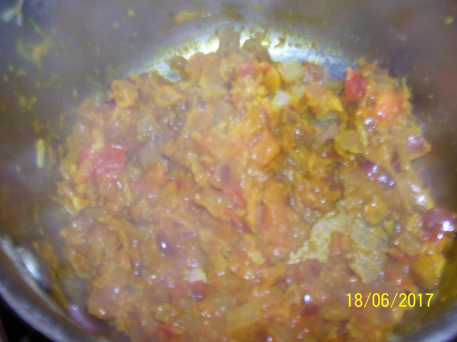 4. Then add the red Tomato NOT the green ,stir and mix .Add the coriander powder and turmeric powder and mix.